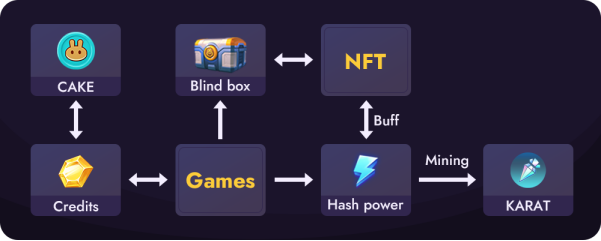 <table data-header-hidden><thead><tr><th width="135"></th><th></th></tr></thead><tbody><tr><td>CAKE</td><td>Swap CAKE (0x0E09FaBB73Bd3Ade0a17ECC321fD13a19e81cE82) tokens for gold credits, your key to unlocking new adventures.</td></tr><tr><td>Gold Credits</td><td>Use these credits to power up your gameplay and access exciting games.</td></tr><tr><td>Games</td><td>Join thrilling games to have fun and earn a fortune.</td></tr><tr><td>Blind Boxes</td><td>Earn in-game blind boxes and open them to reveal rare NFTs.</td></tr><tr><td>NFTs</td><td>Deploy digital characters as NFTs to supercharge your computing power.</td></tr><tr><td>Hashpower</td><td>Convert game activity into hashpower to fuel your mining efforts.</td></tr><tr><td>KARAT</td><td>Mine KARAT tokens, the ultimate treasure that strengthens your game presence and gains even more value as you stake them.</td></tr></tbody></table>